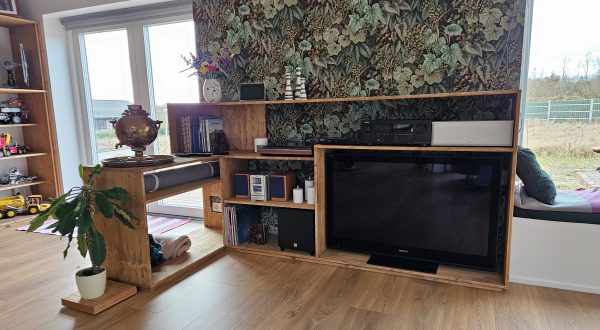 Mediereolen er som det sidste af de store møbler endelig blevet færdig. Det har været svært at blive helt enige om hvordan det skulle se
